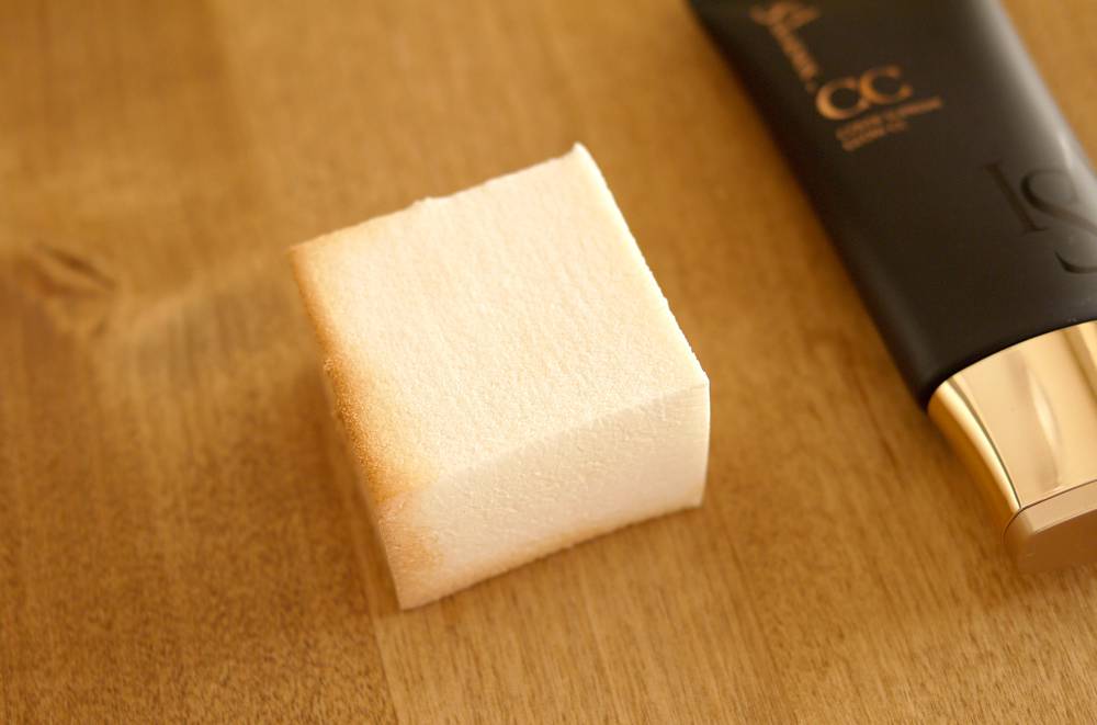 CCクリームを頬・額・顎においてからスポンジでぬってみる